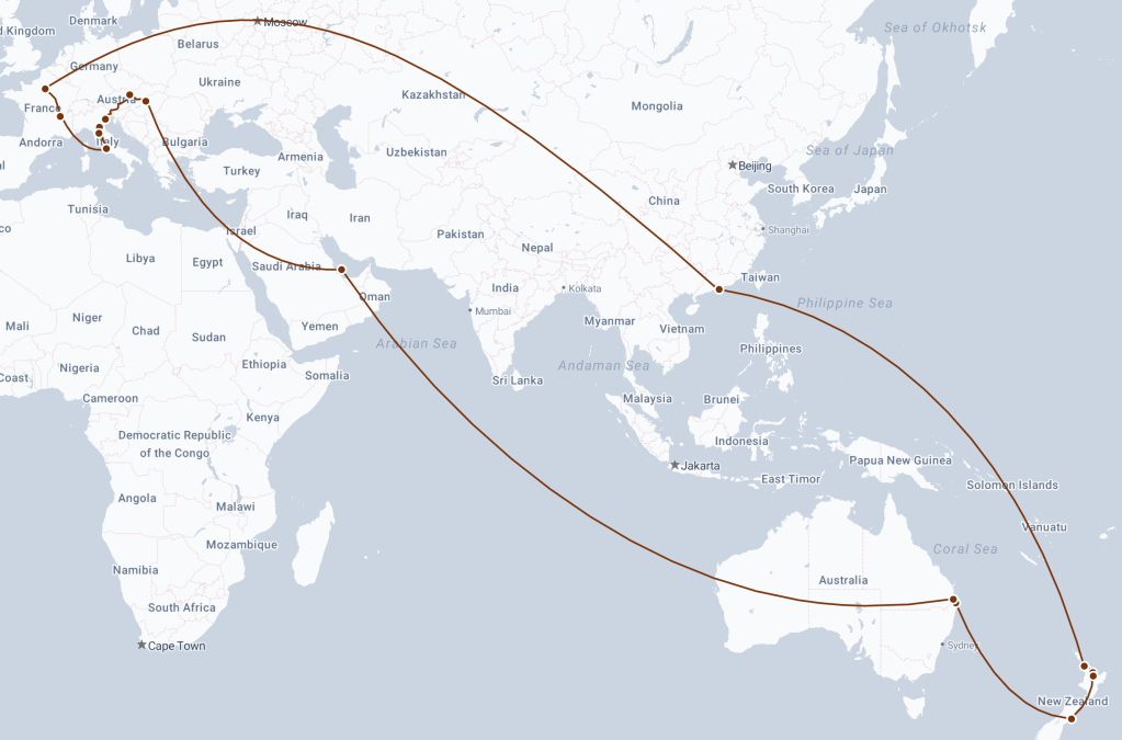 Gold Coast, Doha, Budapest, Vienna, Venice, Bologna, Florence, Rome, Lyon, Paris, Hong kong