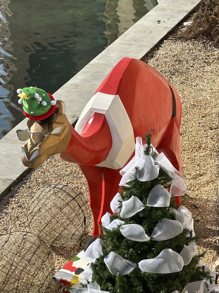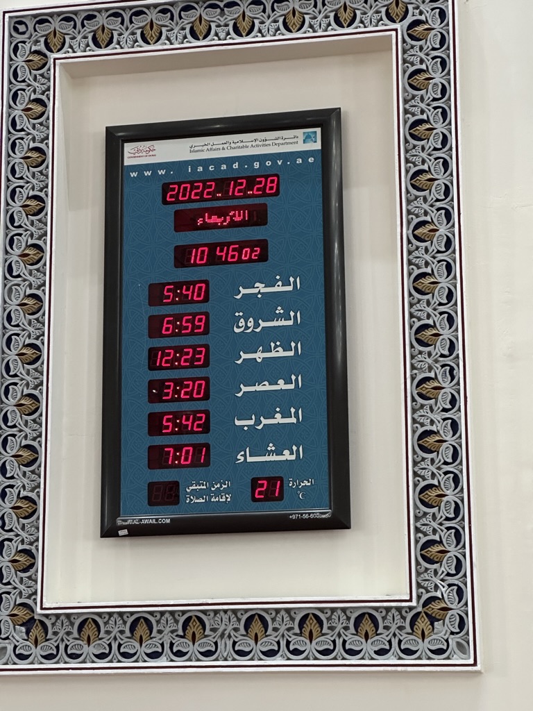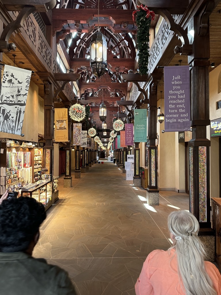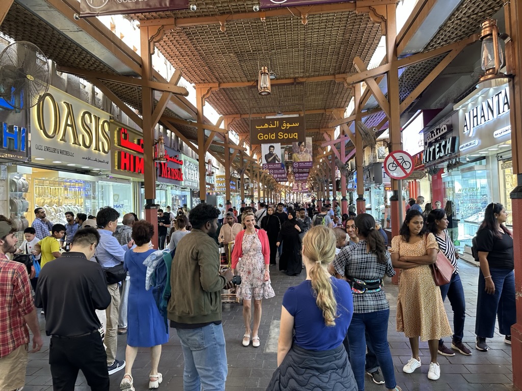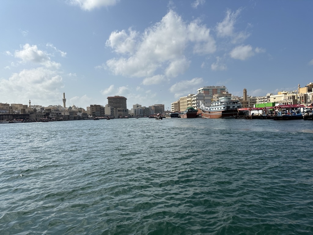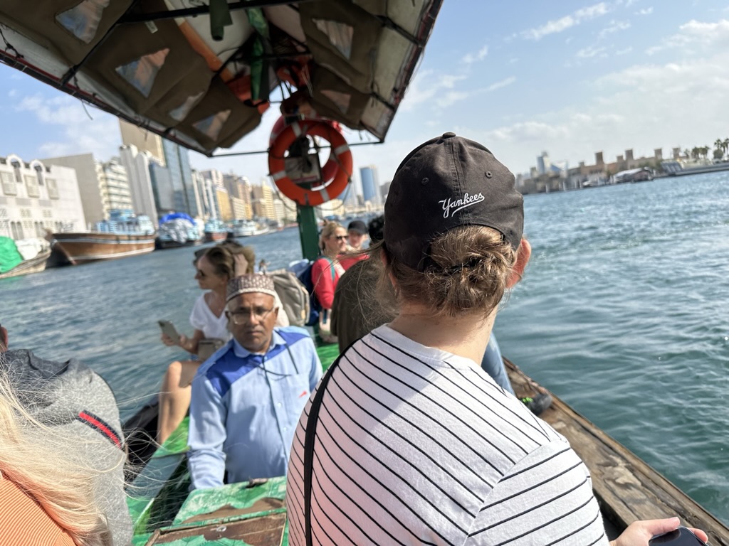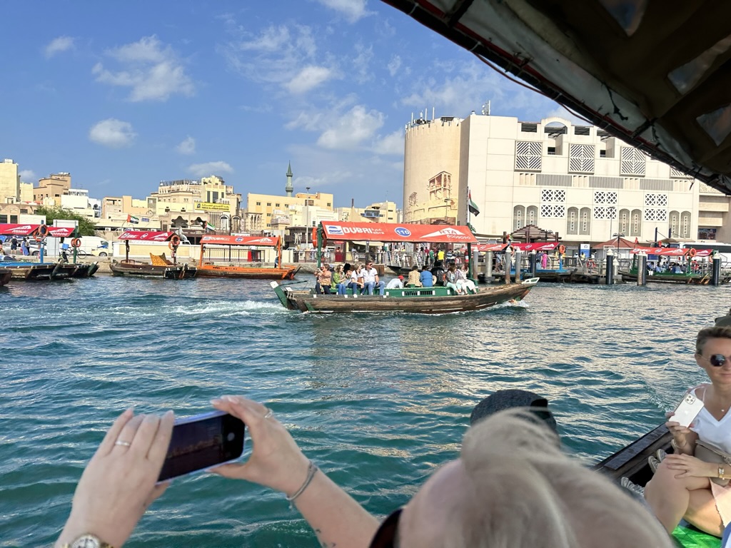 We then headed to the old Dubai souks (markets). Pablo gave us some advice on what to buy and how to buy. We tried some mint stone which is good for curing sinus issues – it was definitely strong smelling! There were so many hawkers trying to sell you things – they could be ignored and weren’t overly pushy, but it was still hard work. Lisa tried to haggle with a guy for a magnet, but he wasn’t having any of it. In the end we couldn’t find the magnet anywhere else, so we had to go back and pay full price! We then boarded boats to cross the Dubai creek before boarding the minibus again for our final stop. This was a restaurant in the original part of Dubai. The area felt very old and was part of the original 55 houses of Dubai. We looked at some photos showing the history of Dubai which again emphasised how far the country had come in such a short time. We finished with a traditional coffee (sweetened with dates) – I quite liked it, but it was a bit exotic for Lisa.