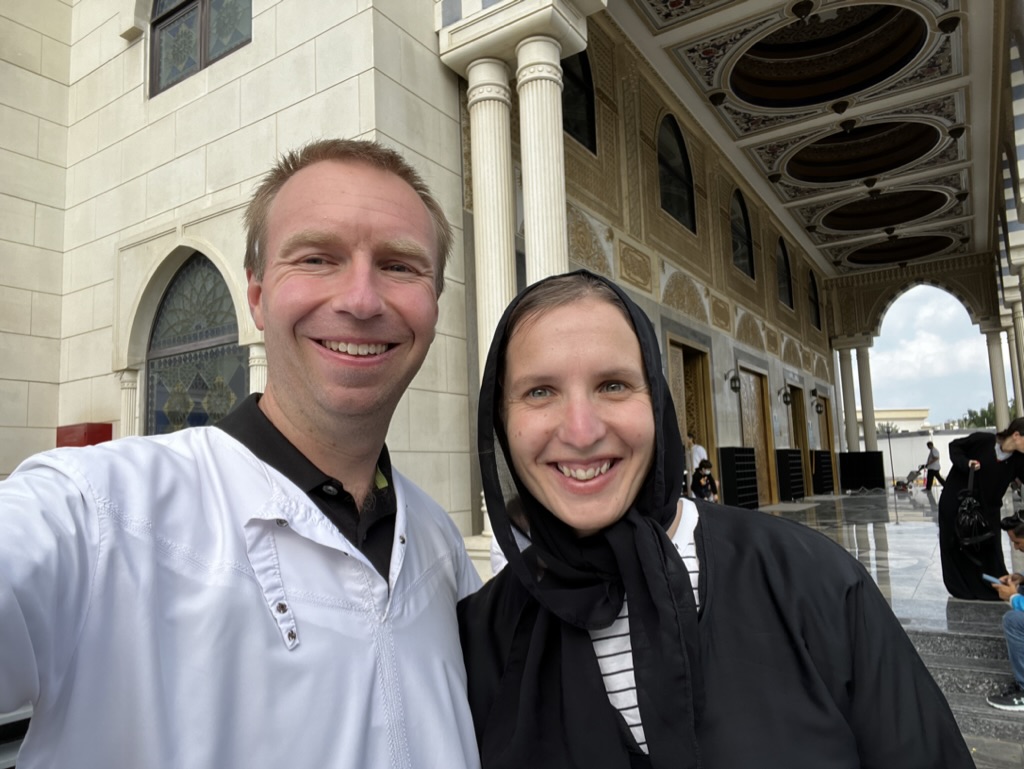 Next stop was the Blue Mosque named that as it is based on the Blue Mosque in Istanbul. We had to wear robes to cover our legs and arms. Lisa also wore a shawl to cover her head. The mosque was very impressive. It felt so quiet and peaceful. The mosque was huge and had four even taller minarets. It had very detailed inscriptions around the roof and walls and felt like a European cathedral but without the opulence.