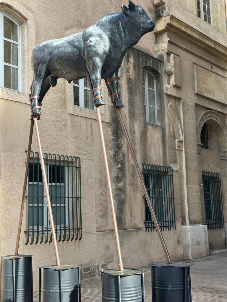 - The town hall with a weird cow on stilts outside