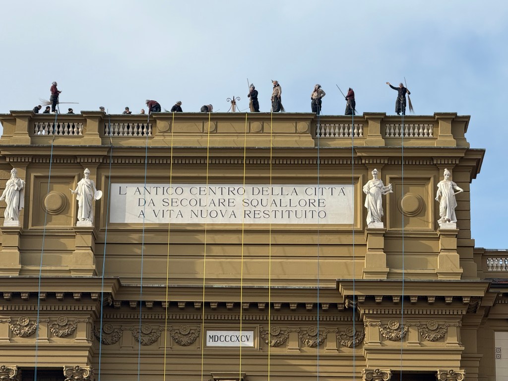 As we wandered around we came across a big group of people waiting in a square with abseiling equipment hanging from a massive arch. Like everybody else we stopped and watched. Unfortunately nothing happened and it was very unclear when it would happen. Eventually we wandered off but when we came back to the square a while later the crowd was even bigger and it was obvious something was going to happen. In Italy on the feast of the Epiphany Befana gives toys to children, basically the Italian version of Santa. Befana is an old lady, a bit like a witch, who rides on a broomstick. The people abseiling were dressed up as her and would drop in on the crowd. Unfortunately it was all very slow and didn’t hold our attention for long.