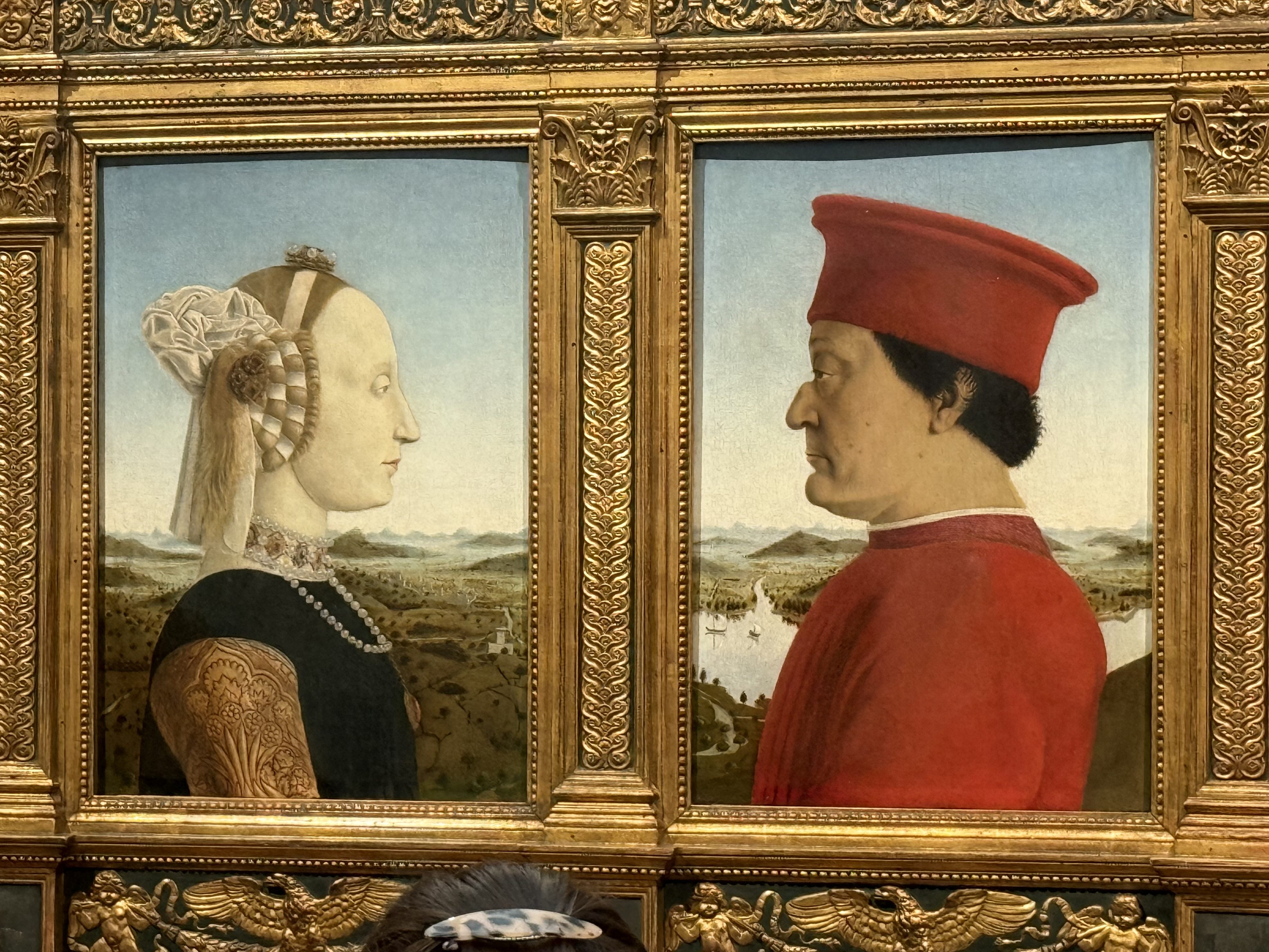 - Famous dual paintings of husband and wife. Sadly the wife was painted after she had passed away in child birth. As the guide pointed out there were no photos back then and so having a picture was one of the few ways to remember what someone looked like. The left to right order of the subjects was different from expected as the husband had lost his left eye in a fight. So he wanted the picture to capture his good side. As a result of losing the eye he obviously couldn’t see well from the right so he had the top part of his nose chiseled off so he could see better – crazy! Especially with no reliable anesthetic back in those days!
