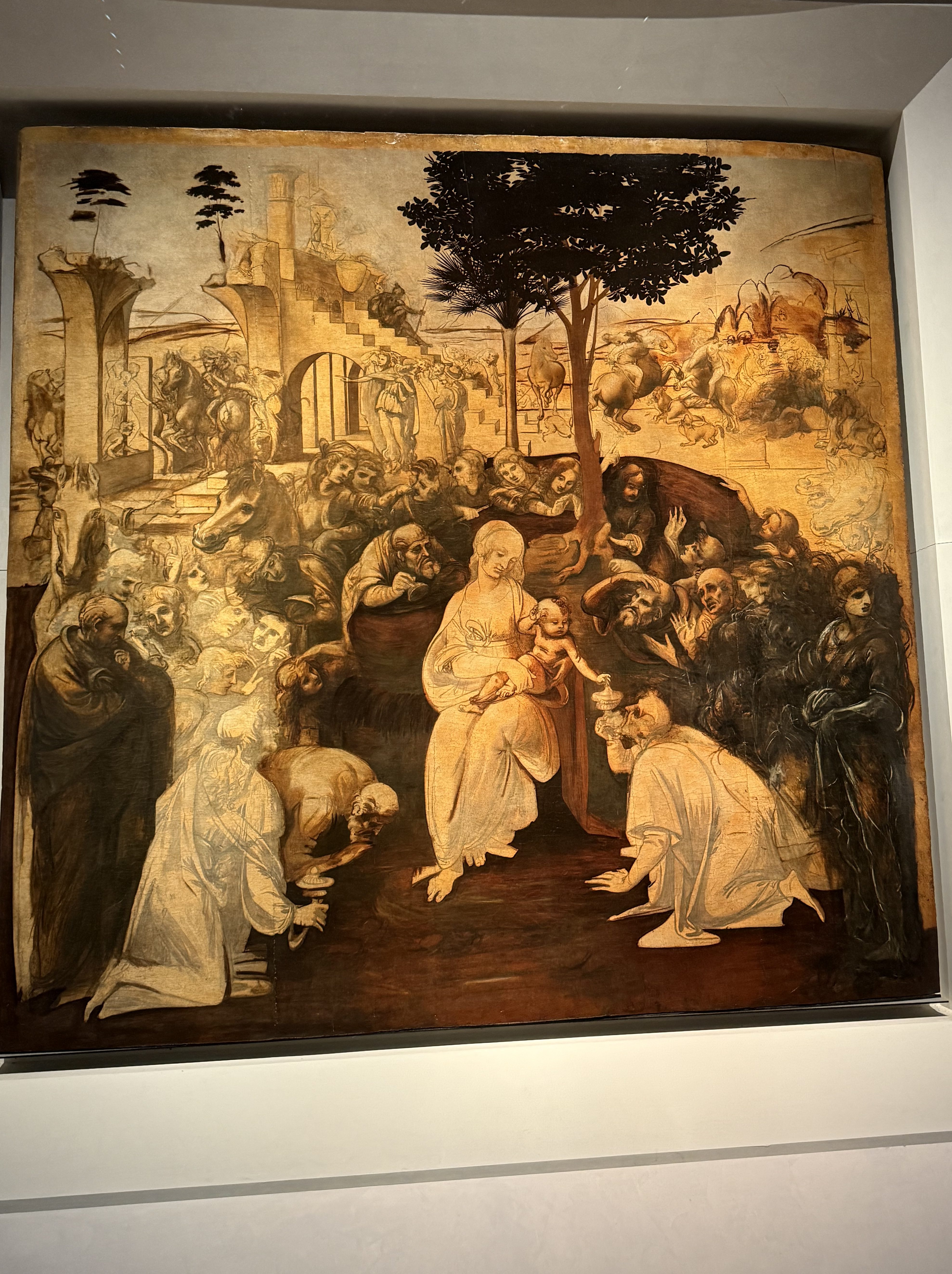 - There was also a partially completed canvas from Leonardo. Some parts had been painted but a lot of it was just sketched. This provided an insight into his process of creating the finished painting
