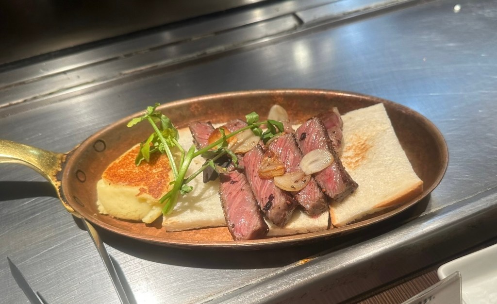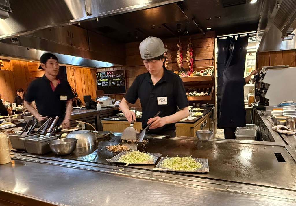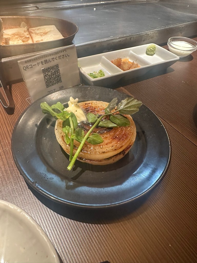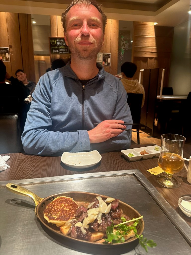 Dinner was at a teppanyaki place called “200 degrees” Lisa found which was very good. We had wagyu steak, vegetables, a weird cheese and garlic pizza, a grilled onion and an okonomoyaki. Best meal we have had in Japan! We sat at the grill so we could watch them cook the food which was also great fun.