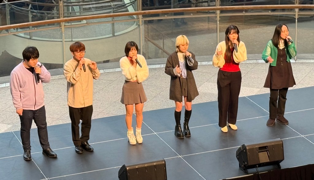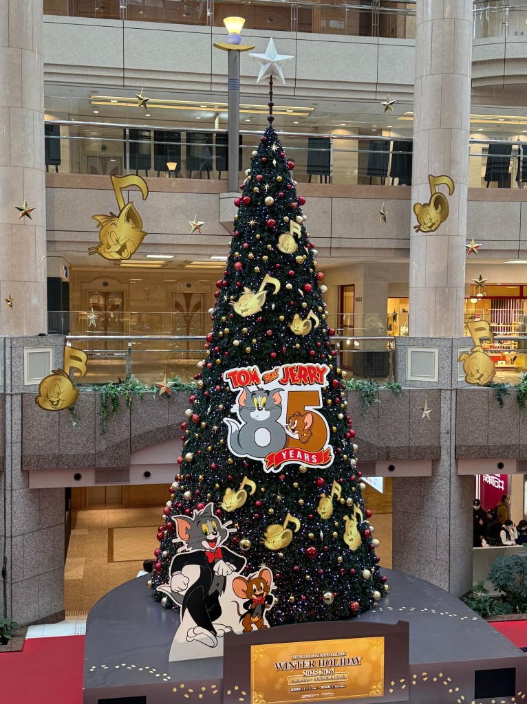 First up was the landmark building which used to be the tallest in Japan. From ground level there wasn’t much to see other than it being a big building. The mall underneath it was underwhelming. Although it did have a weird Tom and Jerry Christmas setup. We ended up at the mall next door for lunch. Lisa had some bakery stuff (boring). I had a very nice karage chicken meal. In the mall there was a stage with Japanese high school a capella singers performing – it’s fair to say they were not very good (in fact, some were flat our terrible).