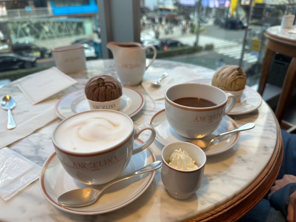 Speaking of France – one of our favourite places in Paris is the Angelina’s tea rooms. We found one up the road in Harajuku. It is fair to say it wasn’t as classy as the Paris experience (the service was very poor which is a surprise in Japan). I did get their famous hot chocolate which is very nice but incredibly rich. We shared a couple of the Mount Blanc’s for which Angelinas’ is most famous for. They only do the Mount Blanc’s in Japan rather than the variety of pretty pastries that you get in Paris. However they are smaller which is good – as it is a lot of sugar!